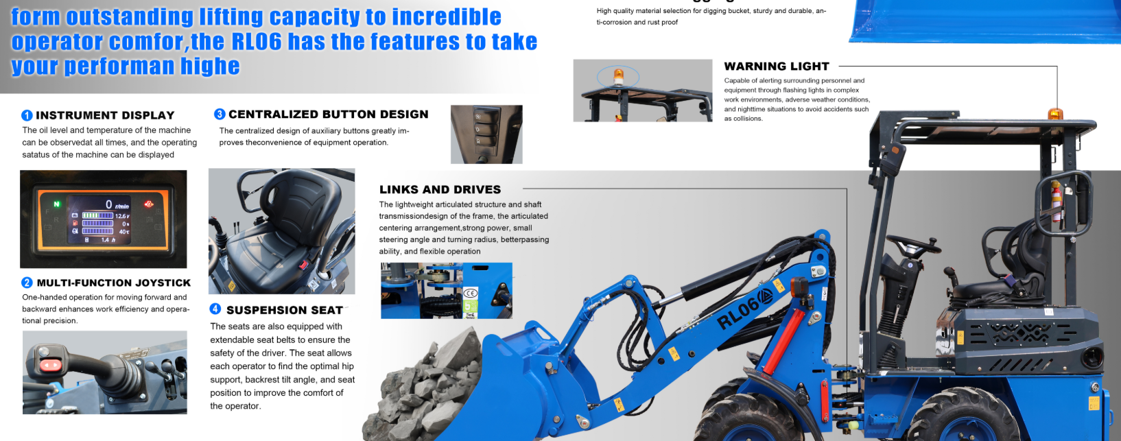 Den er udstyret med en Kubota dieselmotor på 25 hk, som sikrer driftssikkerhed og lavt brændstofforbrug på cirka 1,25 liter i timen. RL06 har en gravedybde på 2,2 meter, en løftekapacitet på 600 kg og en vægt på 1.725 kg, så den kan transporteres på trailer uden problemer.